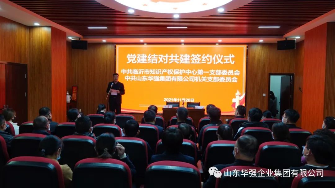 2021年11月26日下午3:00,在华强集团党建展馆举行了临沂市知识产权保护中心第一党支部与华强机关党支部党建结对共建签约仪式。