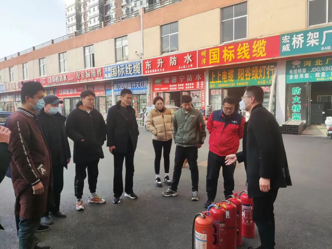 3月3日,建材物流城对市场业户灭火器进行年检换粉。